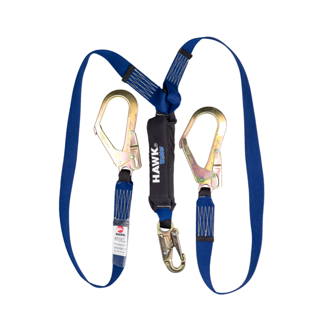Cinta o cuerda doble brazo de Kevlar® Nomex® con una resistencia a la tensión mínima de 7,000lbs y a una temperatura máxima de 426°CEl material brinda la propiedad de no fundirse y . de no propagar la flama provocada por una posible chispa. La línea sirve para asegurar el arnés a un punto de anclaje mediante dos ganchos grandes de seguridad de 217mm con una apertura de Ø50mm. Además cuenta con un amortiguador que disipa el impacto en un evento de caída